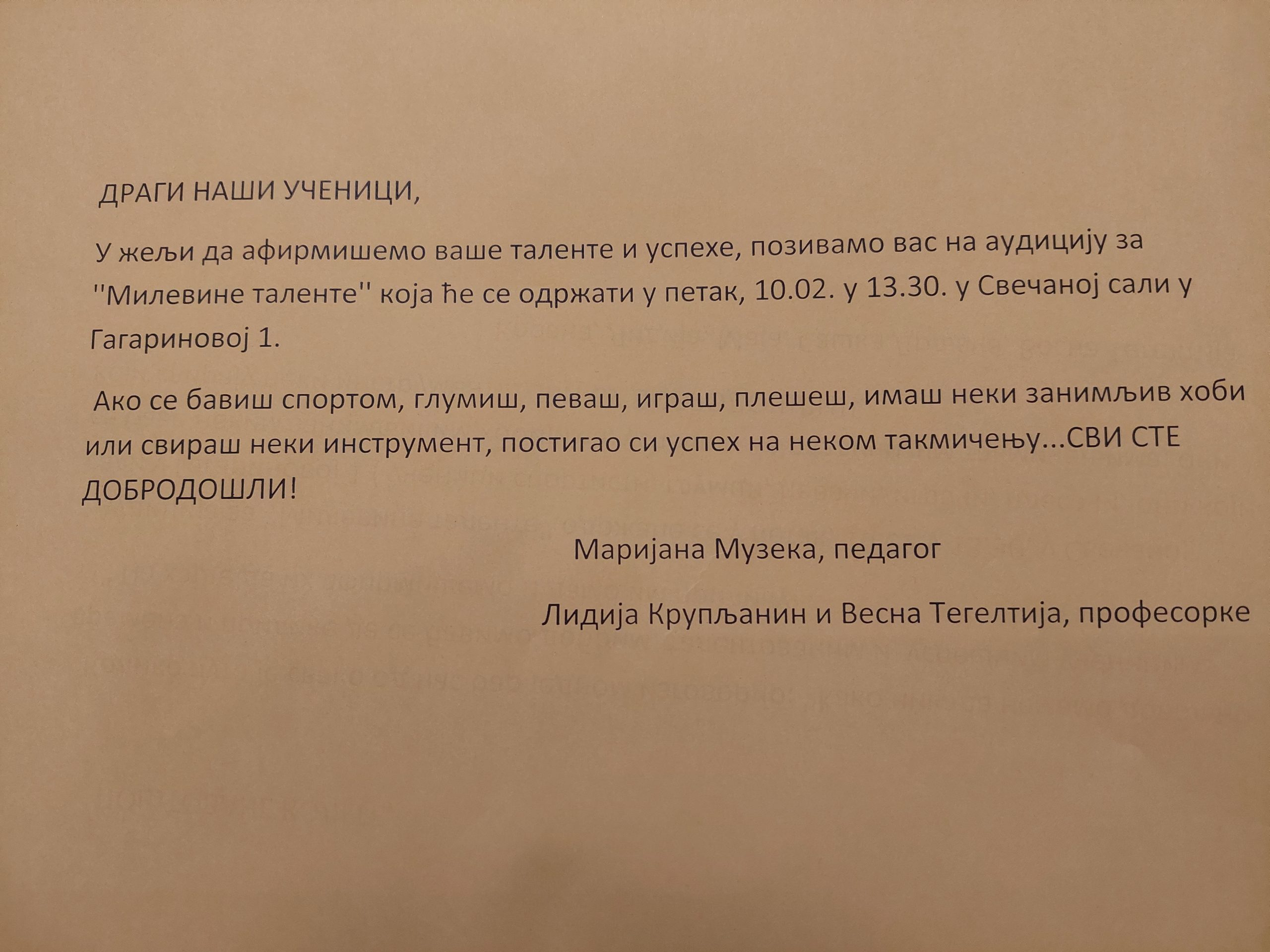 АУДИЦИЈА ЗА МИЛЕВИНЕ ТАЛЕНТЕ