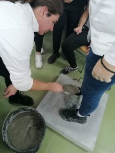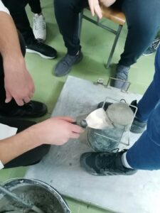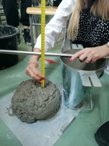 Блок настава из Испитивања материјала и конструкција одржана је 22. и 23. октобра у школској лабораторији. Ученици одељења ГТ31 су овом приликом испитивали конзистенцију свеже бетонске масе, која представља меру обрадљивости бетона у свежем стању. Кроз цео процес водиле су их професорке Биљана Миленковић и Милица Шљивар. Овог пута су испитивали конзистенцију помоћу методе слегања и методе распростирања. За прву методу, методу слегања, ученици су самостално направили рецептуру бетона. За испитивање им је био потребан Абрамсов конус, метална шипка, као и основни прибор за справљење бетона. Након направљене бетонске смеше, ученици су пунили конус у три слоја, али тако да се сваки слој прво морао сабити са по 25 пробадања металном шипком. Након завршеног процеса пуњења конуса, конус се полако диже и посматра се слегање бетона. Абрамсов конус се наопачке поставља поред бетонске смесе и тако се помоћу метра очитава слегање бетона. На основу добијених резултата, ученици су установили да су добили течну