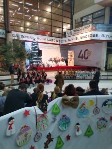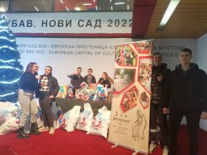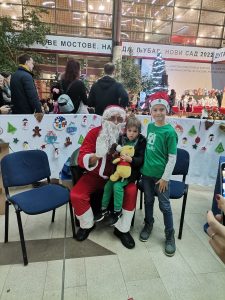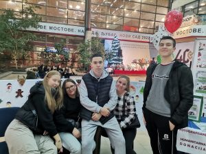 Тринаест ученика одељења Гео21 се пријавило да од 26. до 28. 12. 2022. волонтира на Новогодишњем дечијем сајму на СПЕНС-у. Били су у улогама Деда Мраза, водитеља, аниматора, техничке подршке… Ова акција је наставак сарадње са г-ђом Мајом Болехрадски, једном од највећих хуманитараца у граду и чланицом многих градских удружења.